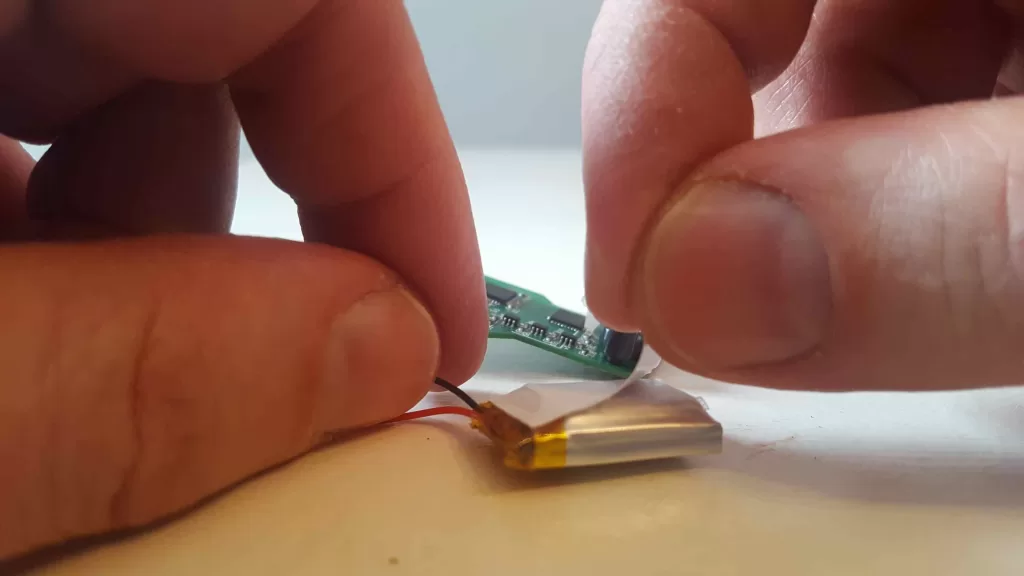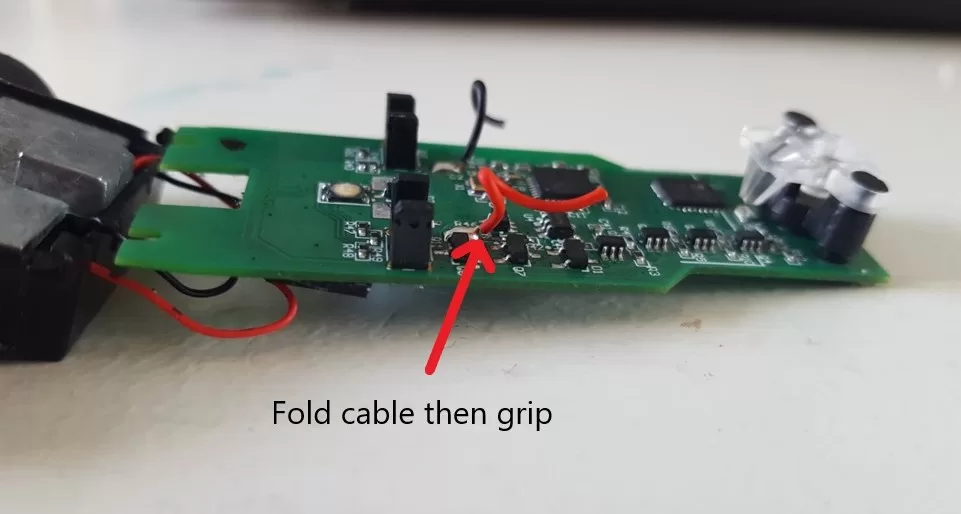 Once you have the old battery removed you can strip the ends so as to expose some metal, this is the trickiest part of the whole process as you need to ensure you don’t pull the sleeve (coloured covering) off the wire, you need to fold the wire as low down as possible then grip here with your fingers whilst trimming to avoid this happening, try to get this as near to the circuit board as possible, you can then use wire strippers, or gently use a pair of scissors as shown, complete this process on the red and black wires.