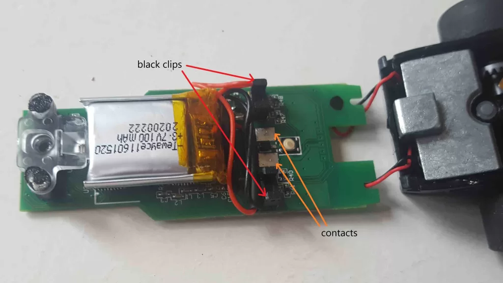 Press the battery on to the circuit board. Ensuring that no cables cover the contacts or black clips