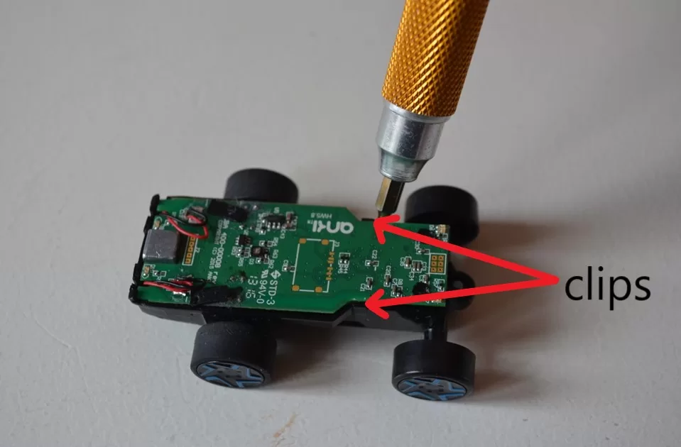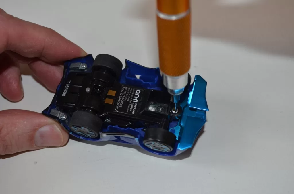 Take your Anki Overdrive car, turn over and using the pozi screwdriver undo the single screw at the front near to the front wheels.
