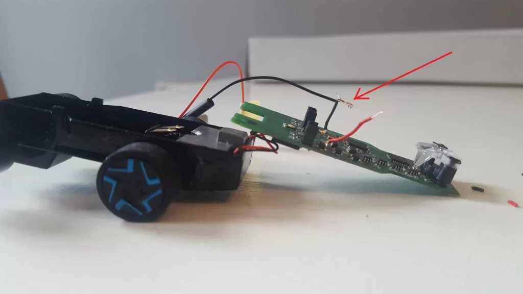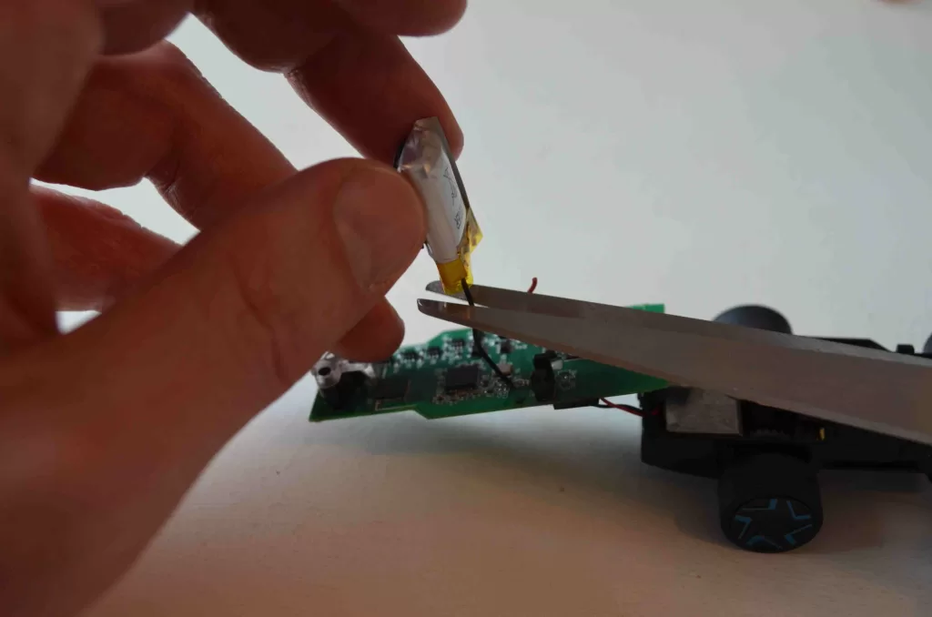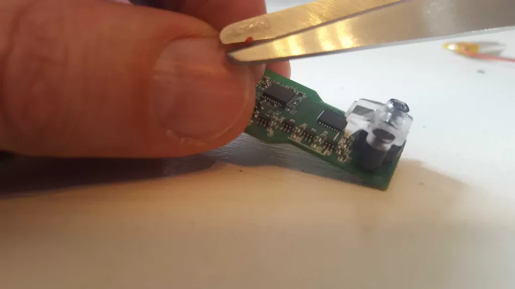 Taking your scissors, cut the old battery off as near to the battery body as possible, PLEASE NOTE do this one wire at a time or you could short the circuit board. I always start with the live wire the red one.